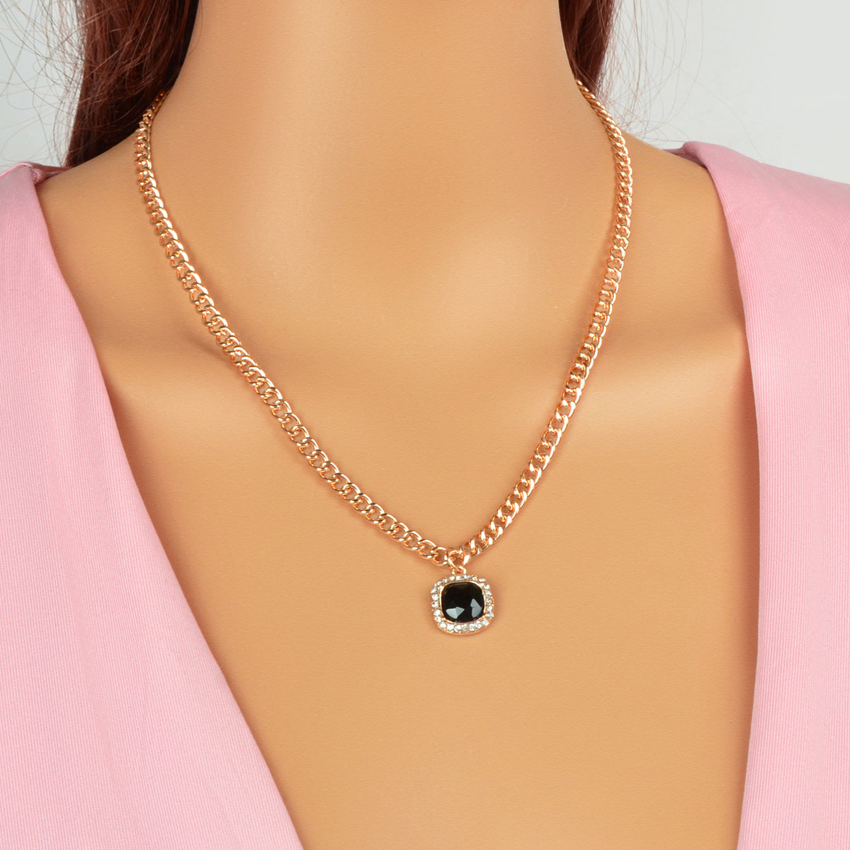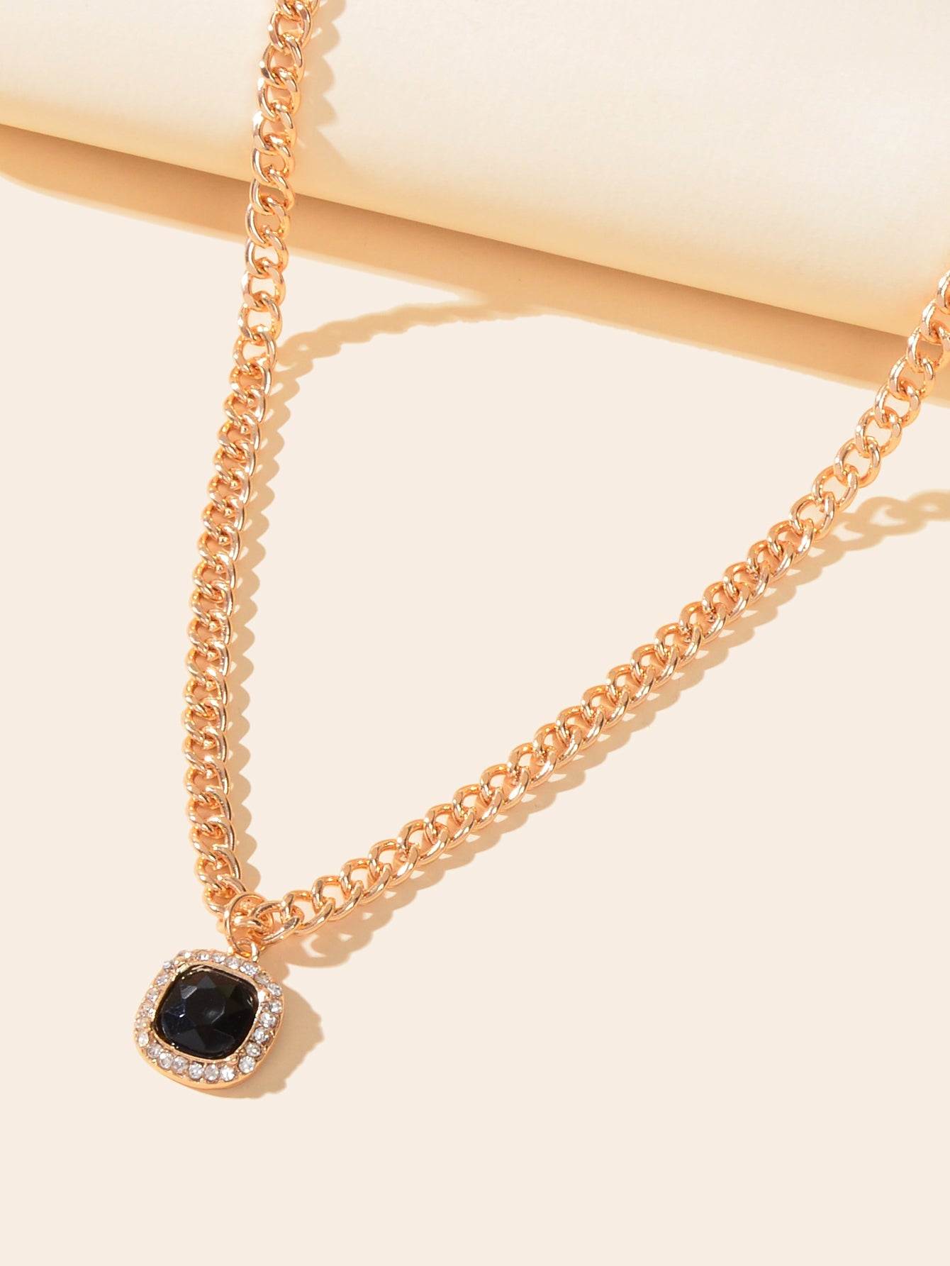 Exquisite Gold Chain Rhinestone Decor Black Square Pendant Women Dinner Necklace